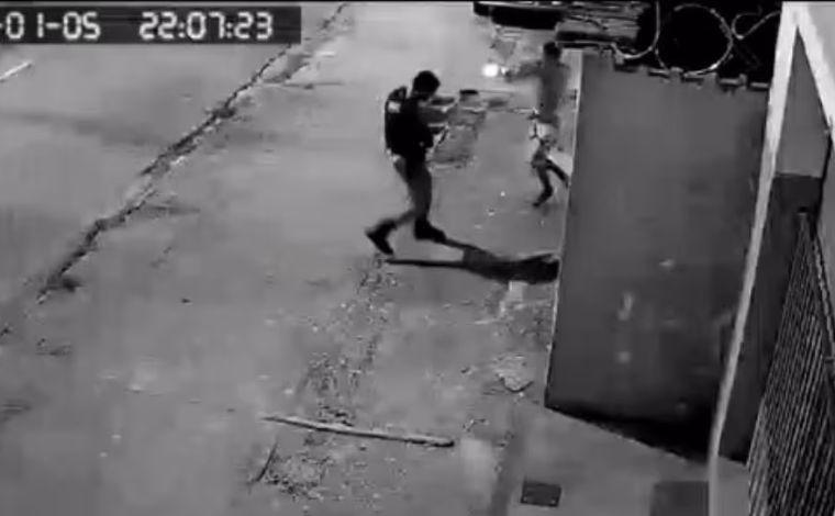 Um deles foi alcançado por um sargento. Imagens de câmeras de segurança mostram o momento em que o militar se aproxima do suspeito e da ordem de parada, mas é surpreendido pelo criminoso, que saca uma arma e atira à queima-roupa contra o policial.