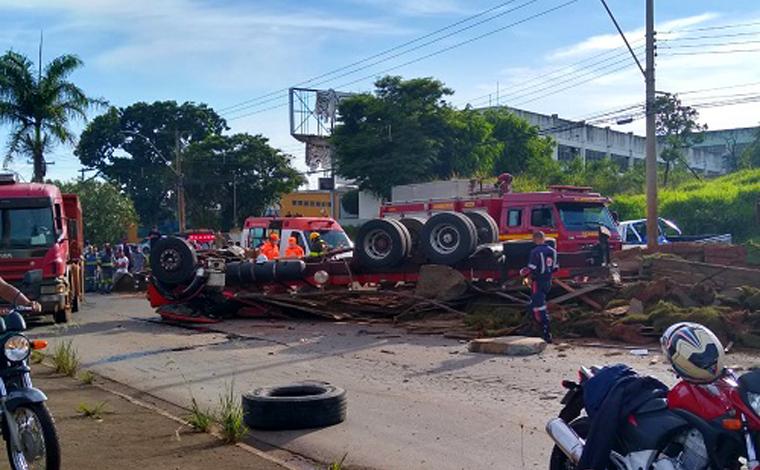 Conforme a corporação, os pneus do veículo estouraram, fazendo o motorista perder o controle da direção. O caminhão chegou a atravessar o canteiro central e capotou do outro lado da avenida.