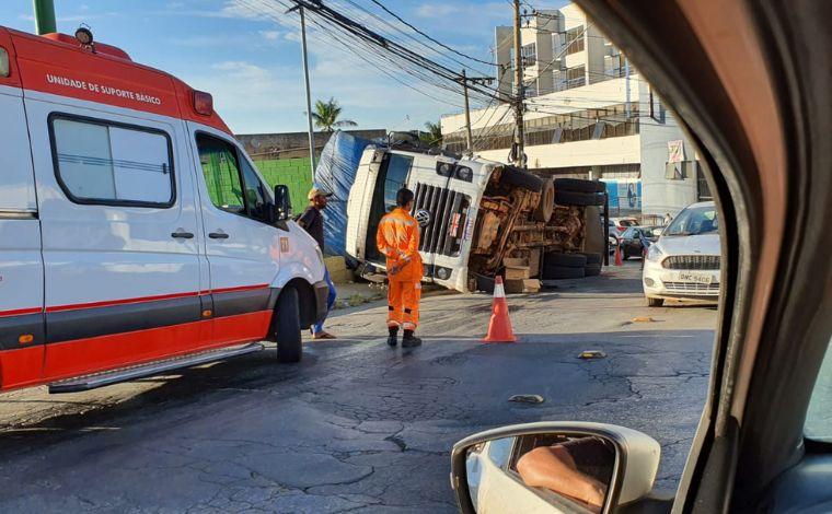 O veículo seguia no sentido Centro quando acabou tombando. De acordo com informações de testemunhas, a carga do caminhão estava inclinada para o lado direito, o que pode ter causado o acidente. Não há informações sobre o estado de saúde do motorista.