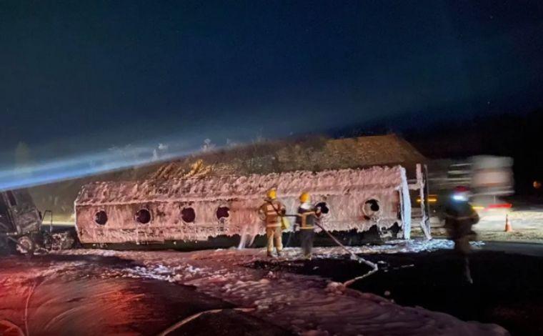 Um caminhão-tanque, que transportava gasolina e óleo diesel, tombou e pegou fogo noite dessa terça-feira (20), na BR-040, em Sete Lagoas. O acidente ocorreu na altura do km 460, no bairro Nossa Senhora do Carmo, sentido Brasília. Quatro equipes do Corpo de Bombeiros atuaram no local para apagar as chamas. Não houve feridos.