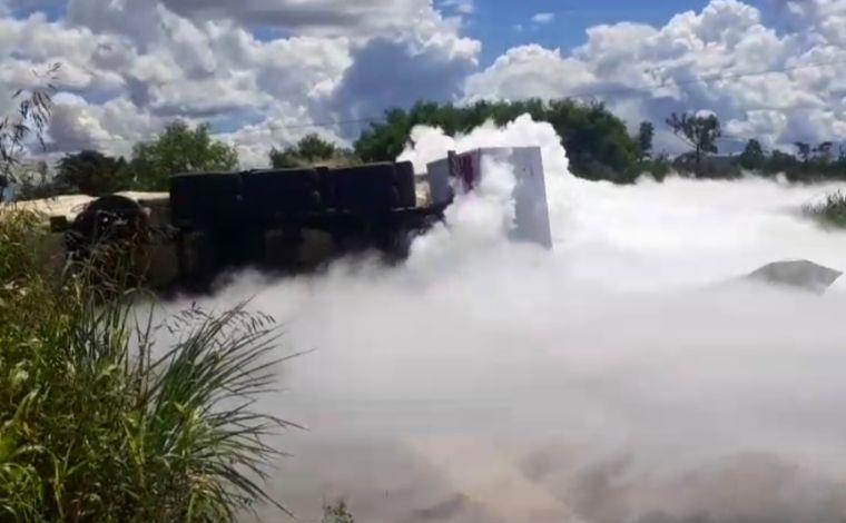 Nas imagens que circulam nas redes sociais é possível ver o produto escapando do tanque, levantado bastante fumaça no local.