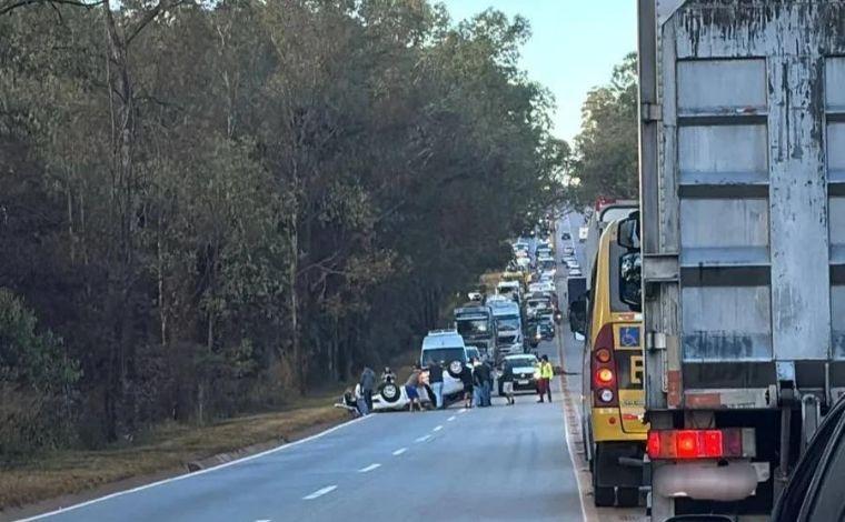 Um carro capotou na manhã deste sábado (22) após colidir com um cavalo na BR-040, na altura do km 564, entre a Lagoa dos Ingleses e o condomínio Alphaville, em Nova Lima, na região metropolitana de Belo Horizonte. O acidente, registrado por volta das 8h, causou interdição total da rodovia no sentido Belo Horizonte e lentidão no sentido contrário.