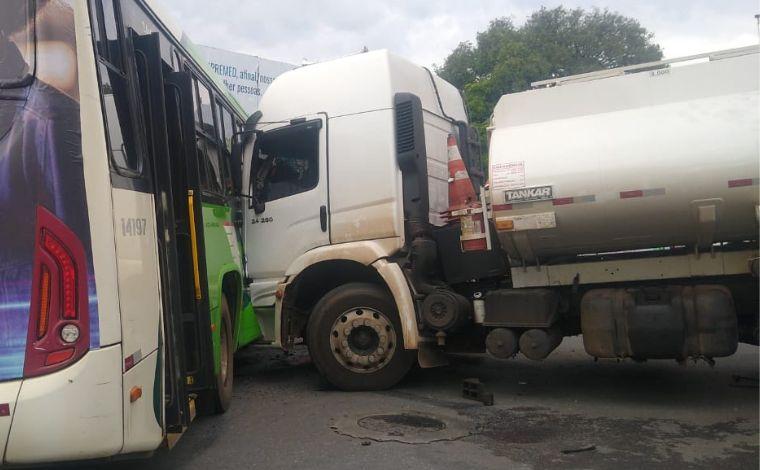 Na manhã deste sábado (12), ocorreu uma colisão entre um caminhão tanque carregado com combustível e um ônibus de transporte coletivo da Turi, no cruzamento das ruas Fernando Pinto e Ilka França, no centro de Sete Lagoas.
