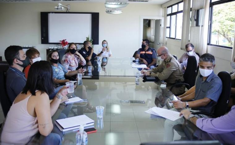 Na manhã desta quinta-feira (17), ocorreu uma reunião entre Procuradoria Geral do Município, Guarda Municipal, Defesa Civil, Código de Posturas, fiscais da Vigilância Sanitária e do Meio Ambiente e Polícia Militar, onde foi definido um amplo plano de ação para fiscalização de comércio e transporte coletivo.