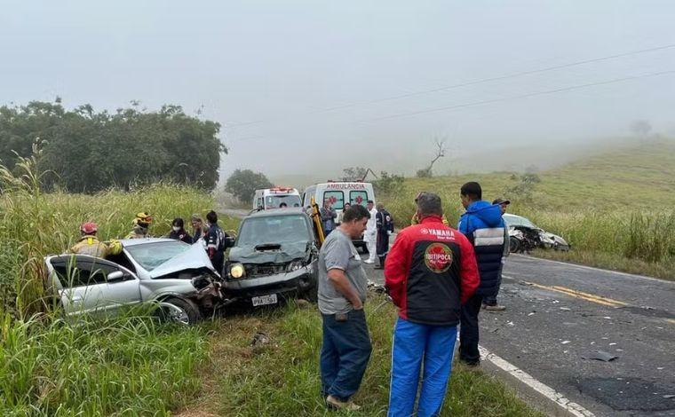 Um acidente envolvendo três carros deixou duas pessoas mortas e três feridas na BR-267, entre os municípios de Bicas e Maripá de Minas, na Zona da Mata Mineira. A ocorrência foi registrada na manhã deste sábado (8).