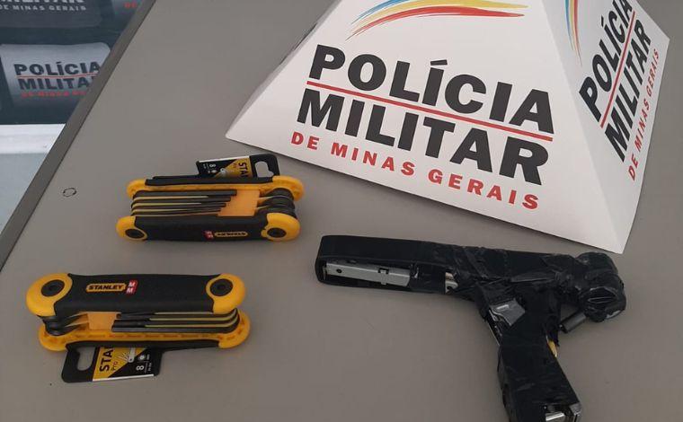 Após rastreamento, os autores foram abordados nas proximidades, de posse de materiais furtados e de um simulacro de arma de fogo.