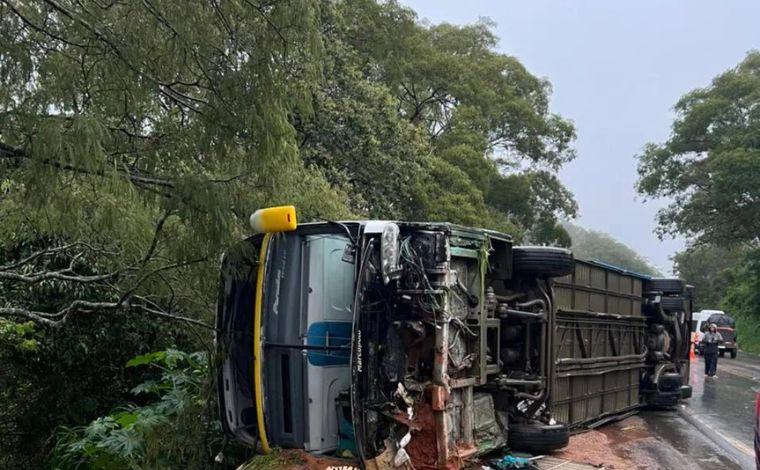 Um ônibus com 42 passageiros tombou e deixou uma pessoa morta e pelo menos quatro feridos na madrugada desta terça-feira (20), na BR-365, em Varjão de Minas, no Noroeste de Minas.