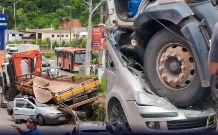 Imagens registradas no local mostram a gravidade do acidente, com pelo menos cinco carros estacionados sendo atingidos. A parte frontal do caminhão, incluindo as duas rodas, ficou sobre o vidro dianteiro de um dos veículos.