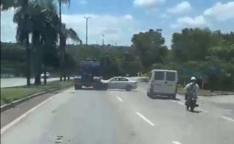 Após ser ‘empurrado’ várias vezes, o motorista perdeu o controle do carro, que rodou na pista e foi parar no sentido contrário da rodovia. Motoristas de outros carros que vinham atrás filmaram parte da ação.