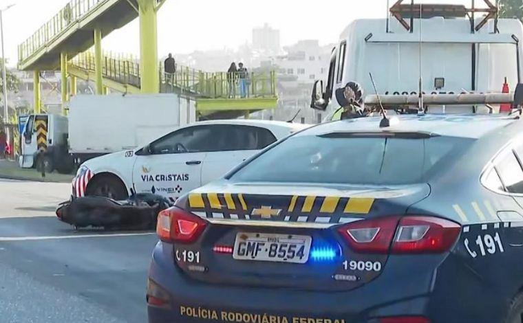 Foto: Reprodução/TV Globo - De acordo com a Polícia Rodoviária Federal (PRF), a colisão envolveu uma motocicleta e um veículo de carga. As informações apontam que a moto atingiu a parte traseira do caminhão