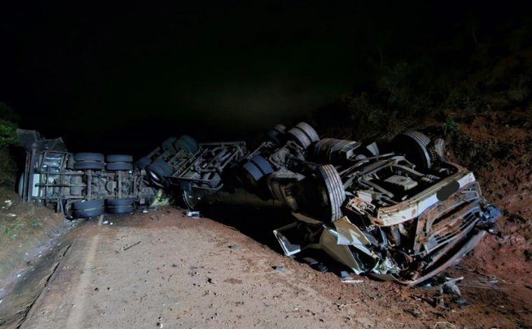 Foto: Divulgação/CBMMG - De acordo com o Corpo de Bombeiros, houve uma colisão lateral entre os veículos. Com o impacto, o caminhão capotou e permaneceu tombado sobre a pista, bloqueando totalmente os dois sentidos da rodovia