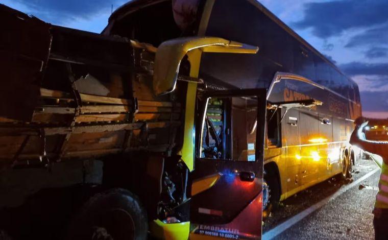 O ônibus, que transportava 25 passageiros e um auxiliar, colidiu na traseira do caminhão carregado com laranjas. O impacto foi tão forte que as vítimas ficaram presas às ferragens.