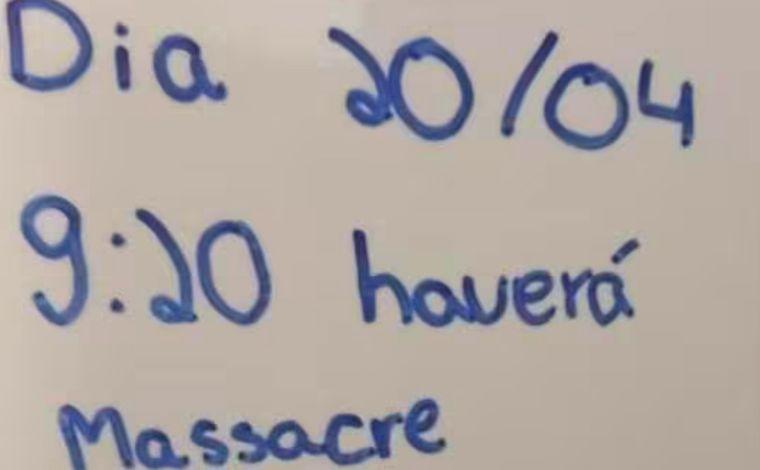 Ao ser questionado pelos policiais, o estudante admitiu ter entrado no banheiro, mas negou ter escrito as ameaças. Mesmo assim, ele foi encaminhado para a delegacia para prestar esclarecimentos.