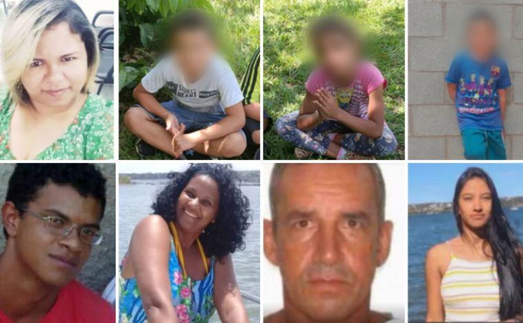 Elizamar da Silva, 39, primeira vítima desaparecida; Thiago Gabriel Belchior, 30, marido de Elizamar; Gabriel da Silva, 7, Rafael da Silva e Rafaela da Silva, irmãos gêmeos, 6, filhos de Elizamar e Thiago; Marcos Antônio Lopes de Oliveira, 54, pai de Thiago; Renata Juliene Belchior, 52, esposa de Marcos Antônio; Gabriela Belchior, 25, filha de Marcos Antônio e Renata; Cláudia Regina Marques de Oliveira, também companheira de Marcos Antônio, segundo o delegado do caso, Ricardo Viana; Ana Beatriz Marques de Oliveira, adolescente, filha de Marcos Antônio e Cláudia Regina