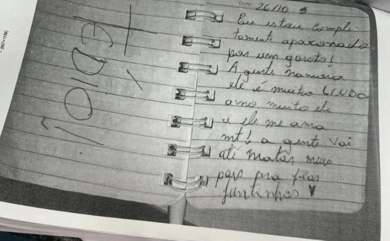 Algumas páginas do diário da menina foram divulgadas pelo G1. "Estou completamente apaixonada por um garoto. A gente namora. Ele é muito lindo. Amo muito ele e ele me ama muito. A gente vai até matar meus pais pra ficar juntinhos", escreveu ela em um trecho.