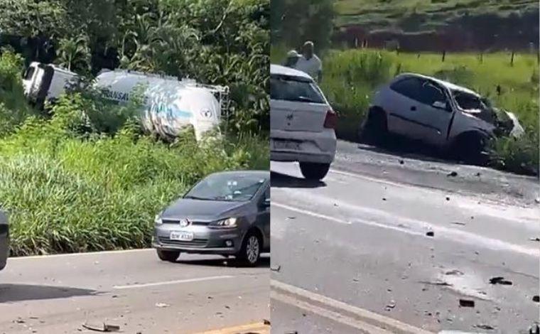 Com impacto da batida, o carro ficou com a frente destruída, enquanto a carreta invadiu a vegetação às margens da rodovia. A Polícia Rodoviária Federal foi acionada para controlar o tráfego de veículos, ocasionando congestionamento na área.