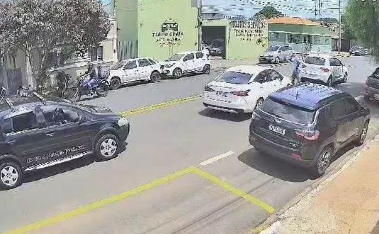 As imagens mostram o momento em que homem do primeiro carro, um Fox branco, desceu do veículo e foi até o segundo carro, um Versa branco, para discutir com o motorista. Ao descer do carro, o homem de 45 anos, segura um cassetete e bate na janela do outro veículo.