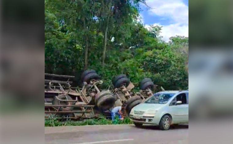 Em um vídeo registrado por motoristas que transitavam pelo local, é possível observar dezenas de pessoas recolhendo os fardos de bebidas que se espalharam da carreta.