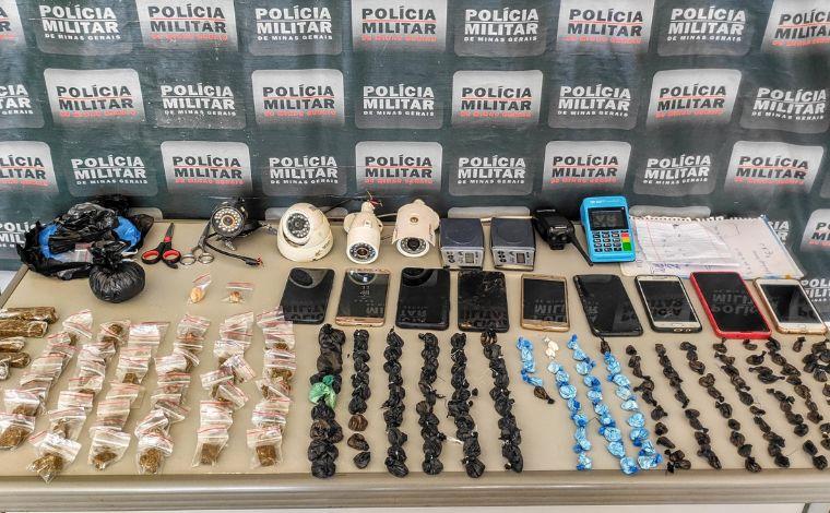 Com eles foram encontrados 174 papelotes de cocaína, 59 buchas e 10 tabletes de maconha, 01 porção considerável de ácido bórico, 02 pedras brutas de crack, 02 balanças de precisão, 04 câmeras de segurança, ️02 tesouras, rádio comunicador, anotações do tráfico, máquina de cartão e material para dolagem. Dois aparelhos celulares foram recuperados e sete aprendidos.