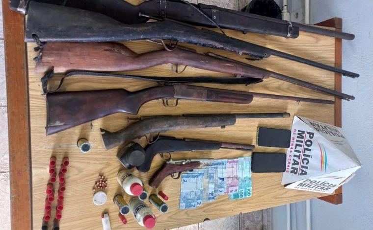 Além das armas, foram apreendidos dois telefones celulares, R$ 240 em dinheiro, pólvora, chumbo, espoletas e cápsulas de munições, e uma armadilha para caça.