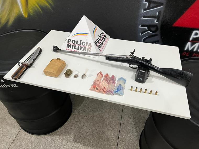Diante da informação, os militares desencadearam uma operação no local dos fatos e aprenderam uma arma de fogo, quatro munições de calibre .32, duas munições de .38, uma barra e uma tablete de maconha e duas buchas da mesma substância, além de uma faca e R$ 27 em dinheiro.