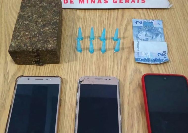A PM entrou no imóvel e encontrou uma mulher, também identificada como autora do crime, e após buscas na residência, foram encontrados 8 microtubos de cocaína, 1 barra da maconha, um caderno com anotações do tráfico de drogas e diversos sacos plásticos para embalagem das drogas, além de aparelhos celulares.
