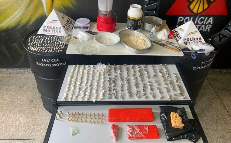 Ao chegar ao endereço indicado, os militares encontraram 133 porções de maconha prensada, duas barras da mesma substância, 121 papelotes de cocaína, 191 pedras e uma barra de crack, além de quatro comprimidos de ecstasy, uma balança e diversos materiais utilizados para o refino das substâncias. Também foram apreendidos 30 cartuchos de munição calibre .380 e quatro munições calibre .38.