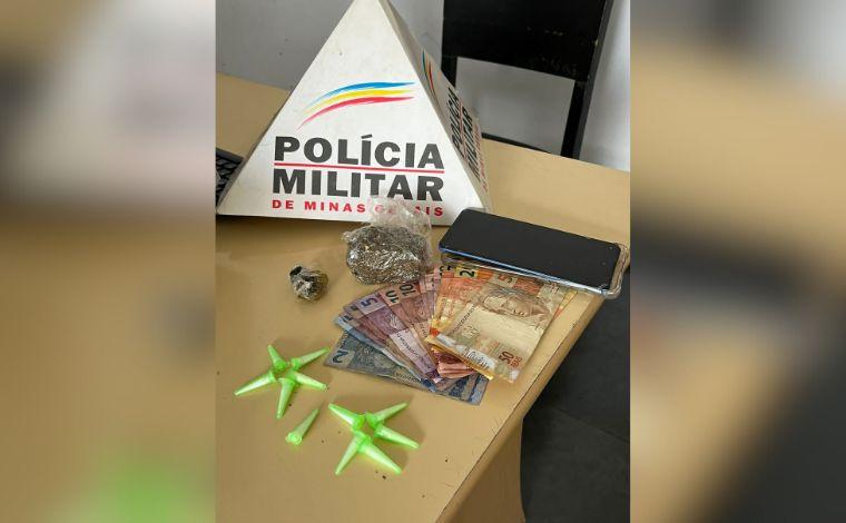 Durante a abordagem, a polícia encontrou com o suspeito uma barra de maconha, uma bola de haxixe, 11 pinos de cocaína e R$ 232 em dinheiro.