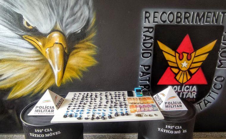 Ao abordarem o suspeito e realizarem busca no imóvel, os militares encontraram diversos itens ligados à prática criminosa. A apreensão incluiu quatro tabletes de maconha, 138 petecas de cocaína, uma máquina de cartão, dois aparelhos celulares e R$ 287 em espécie. O homem foi preso em flagrante.