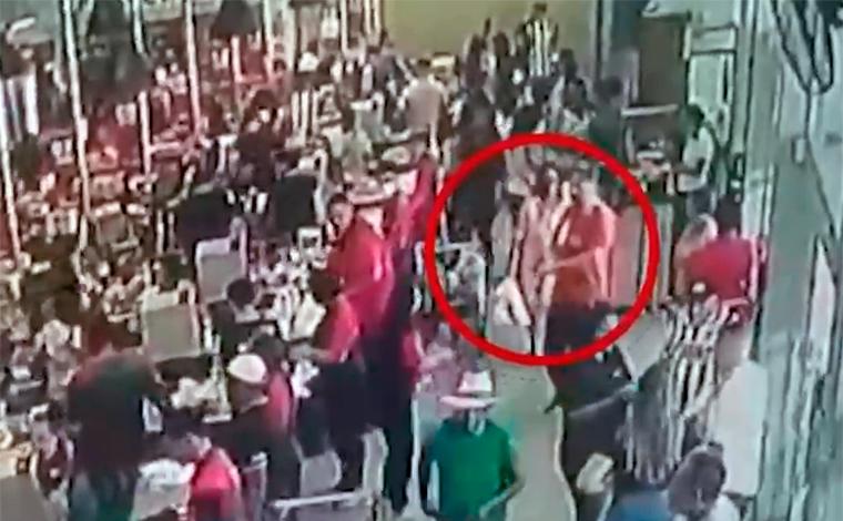 O homem chegou ao local usando boné, calça jeans e blusa de malha vermelha. Ele andou pelo corredor dos caixas, aparentemente procurando pela vítima.