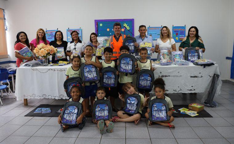 O prefeito Duílio de Castro e a secretária Roselene Teixeira fizeram a entrega simbólica dos kits no Centro Municipal de Educação Infantil São Vicente de Paulo, antigo Colégio Cenecista, na tarde desta quarta-feira, 8 de fevereiro, no bairro Jardim Arizona.