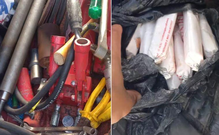 No imóvel, os policiais encontraram diversas ferramentas que seriam utilizadas em arrombamento e mais quatro emulsões explosivas que estavam dentro de uma caixa e debaixo de um tanque de lavar roupas.