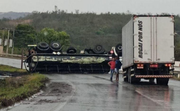 A carreta que tombou atravessou completamente a pista, bloqueando a passagem. O caminhão envolvido no engavetamento foi parar no canteiro central da rodovia.