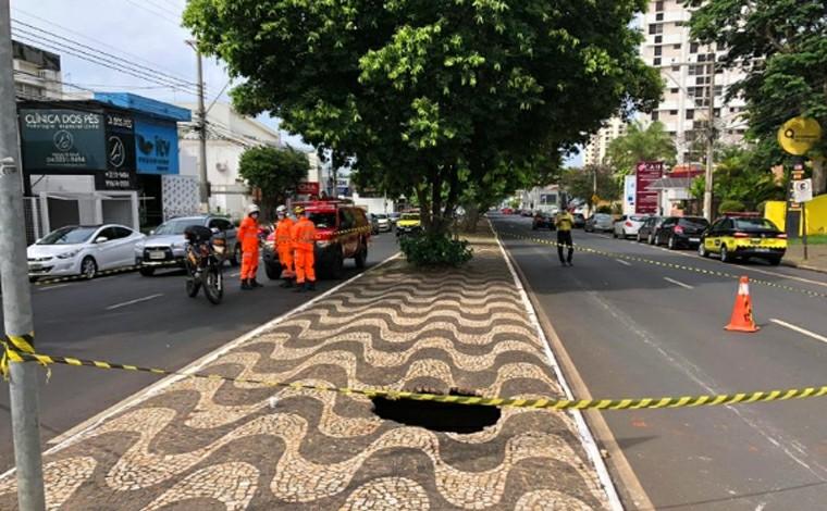 Uma jovem de 19 anos caiu dentro de uma cratera que se formou no canteiro central em uma avenida de Uberlândia. Na manhã desta quarta-feira (16), a vítima caminhava pelo canteiro da via com sua mãe quando a calçada cedeu.