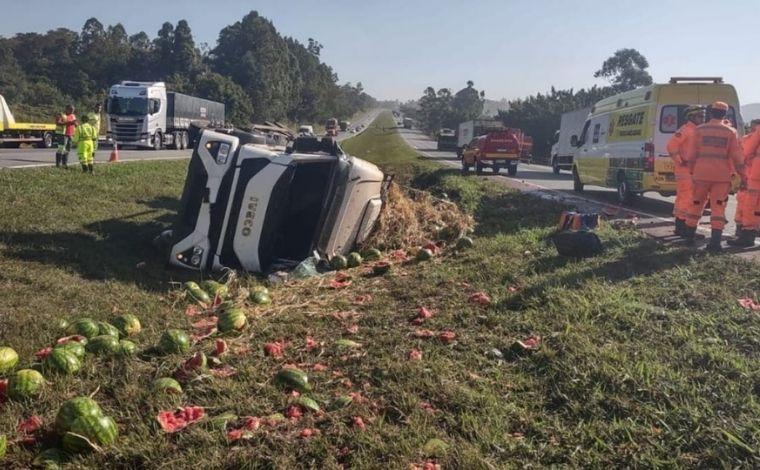 Uma carreta carregada com melancias tombou na BR-040, em Sete Lagoas, na manhã desta sexta-feira (3), na altura do Km 475.