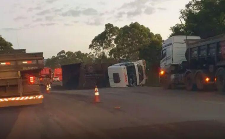 Uma carreta carregada com minério tombou e interditou uma pista da BR-040, em Itabirito, Região Central de Minas, na manhã desta terça-feira (21). O trânsito está operando em sistema pare e siga no sentido Brasília.