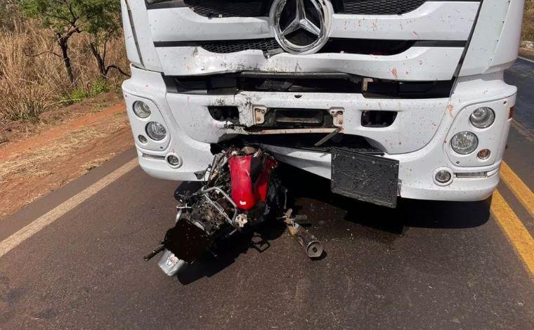 A motocicleta da vítima ficou completamente destruída e presa à frente do veículo de carga após o impacto.