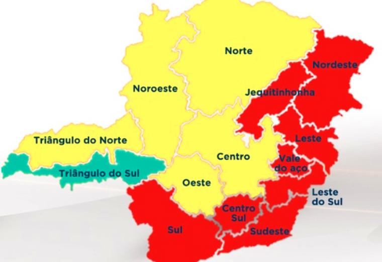 Desta forma, oito das 14 macrorregiões se encontram na onda vermelha (Jequitinhonha, Leste, Leste do Sul, Nordeste, Vale do Aço, Sudeste, Centro-Sul e Sul). Outras cinco estão na onda amarela (Centro, Norte, Noroeste, Oeste e Triângulo Norte). Já a região Triângulo Sul permanece na onda verde.