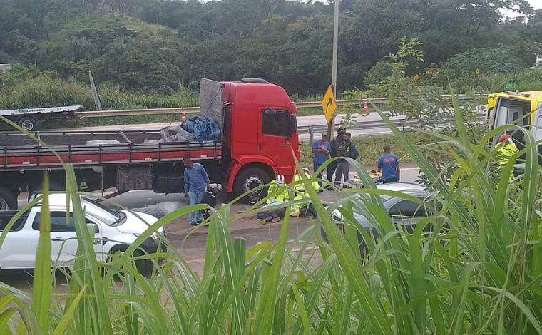 O primeiro acidente aconteceu por volta das 6h30, no km 516 da BR-040, no bairro Vereda, em Ribeirão das Neves. Um caminhão e uma motocicleta colidiram no sentido Rio de Janeiro, causando lentidão no tráfego. A fila de veículos chegou a atingir 9 km. Apesar da rápida intervenção da ambulância da Via 040, concessionária responsável pela rodovia, o homem atendido não resistiu aos ferimentos e veio a óbito no local.