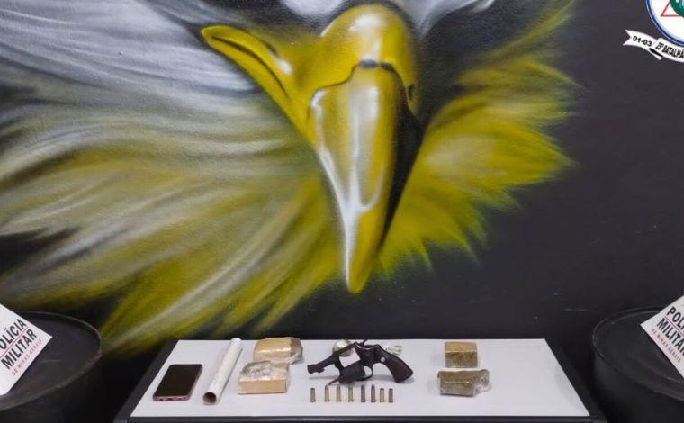 Diante dos fatos, os militares realizaram diligências e localizaram o suspeito na rua Leão da tribo de Judá. No local, os policiais encontraram uma arma de fogo, cinco munições calibre 38, quatro barras de maconha, três tablets de maconha, material para dolagem e um celular.
