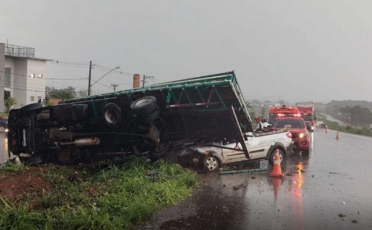Durante a forte chuva, um carro e um caminhão acabaram colidindo na BR-365, próximo ao trevo da Terrena. Com a batida, o veículo de carga tombou em cima do automóvel. O casal que estava no carro, um homem de 45 anos, e a esposa dele, de 45, tiveram ferimentos leves.