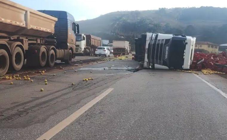 Uma carreta carregada de laranjas tombou na manhã desta quarta-feira (10), na BR-040, no sentido Rio de Janeiro, altura do km 611, próxima ao bairro Santa Mônica, em Congonhas, região central de Minas.