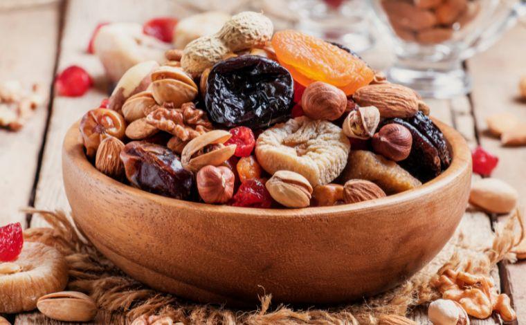 Frutas secas acumulam vitaminas A e do complexo B, e sais minerais como potássio, magnésio e fósforo. Isso porque, no processo de desidratação, vão-se os líquidos e ficam os nutrientes. Inclusive, atualmente a produção de frutas secas conta com tecnologias e estufas eficazes, que minimizam ainda mais as perdas nutricionais.