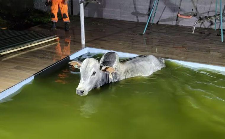 Um boi protagonizou um resgate inusitado na noite de domingo (25) em Juiz de Fora, na Zona da Mata Mineira. O animal invadiu uma casa em construção no bairro Jardim Lermitage, em um condomínio, e aproveitou para se refrescar na piscina do local.