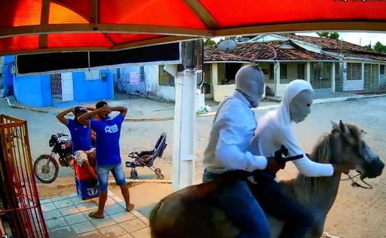 Uma câmera de segurança flagrou o momento em que os assaltantes chegaram montados no cavalo. Do lado de fora do mercado, dois funcionários conversavam quando foram surpreendidos pelos criminosos que estavam encapuzados. A dupla pulou do animal e obrigou os trabalhadores a colocarem as mãos na cabeça.