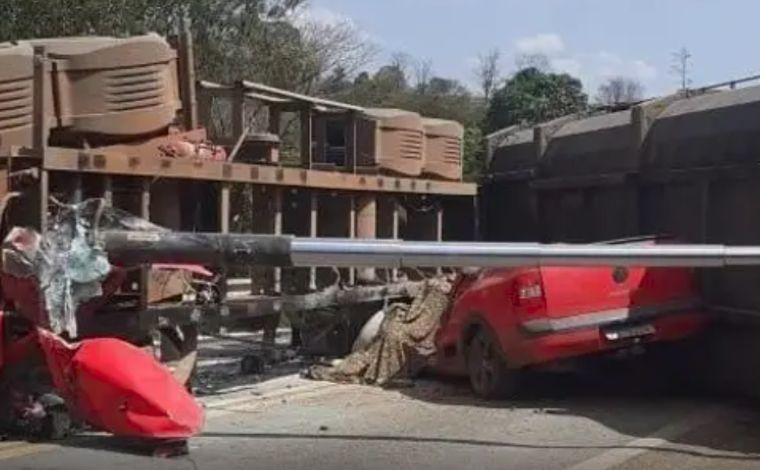 Segundo informações do Corpo de Bombeiros, o semirreboque de uma carreta tombou na pista e se chocou com a caminhonete que seguia no sentido contrário.