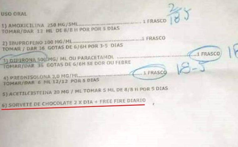 Segundo a mãe, durante o atendimento, o médico não examinou fisicamente a criança. Ele prescreveu diversos medicamentos, incluindo Amoxicilina, Ibuprofeno, Dipirona e Prednisolona. No final, ele perguntou sobre as preferências do menino e adicionou na receita "sorvete de chocolate 2 vezes ao dia + Free Fire diariamente".
