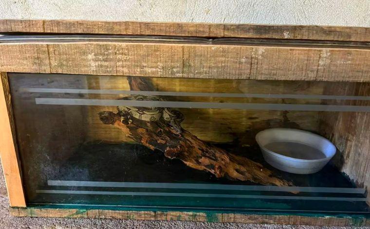 Uma jiboia mantida em cativeiro irregular foi resgatada na última quarta-feira (22) em Açucena, região do Rio Doce em Minas Gerais. Segundo informações da polícia, a serpente era utilizada pelo companheiro de uma mulher como forma de ameaça, alegando que a enforcaria com o animal. O suspeito não foi encontrado durante a fiscalização e permanece foragido.