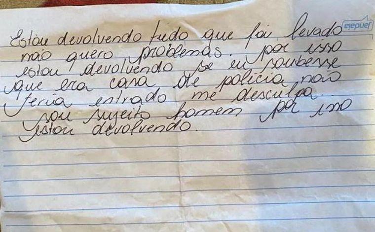 "Estou devolvendo tudo que foi levado, não quero problemas, por isso estou devolvendo. Se eu soubesse que era casa de polícia não teria entrado, me desculpa. Sou sujeito homem, por isso estou devolvendo", dizia o bilhete.